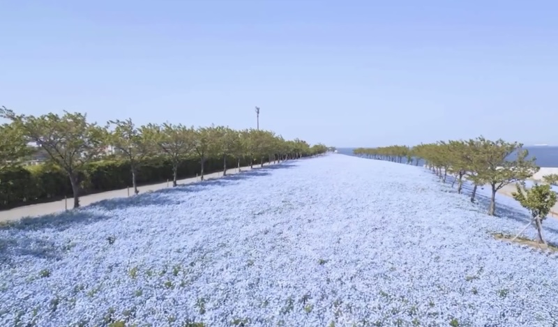 A sea of blue in Osaka – Around one million nemophila flowers transform the park into a continuous blue landscape.